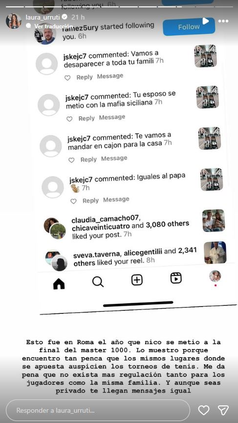 A través de sus redes sociales, Urruticoechea compartió una serie de mensajes cargados de insultos y amenazas que evidencian la hostilidad que enfrentan las familias de los tenistas por parte de sectores vinculados a las apuestas deportivas.
