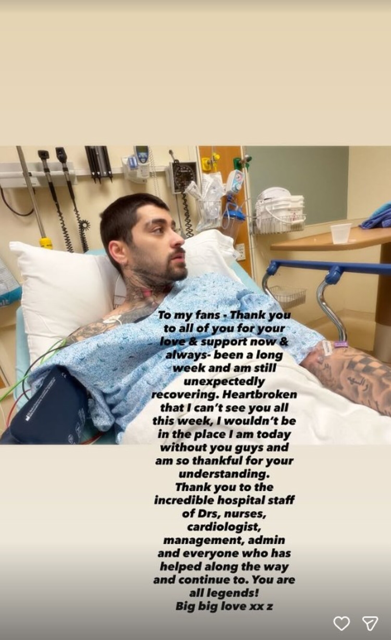 La noticia surgió luego de que el artista publicara un mensaje en su cuenta de Instagram dirigido directamente a sus seguidores, en el que explicó brevemente su situación y les expresó su gratitud. En el texto, Zayn escribió: "Ha sido una semana larga y todavía me estoy recuperando de forma inesperada. Me rompe el corazón no poder verlos a todos esta semana."