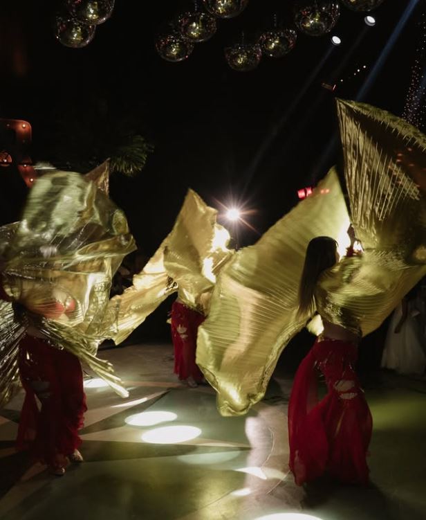 Uno de los momentos más icónicos de la noche: Presentación de la novia con popular traje de danza árabe, acompañada de un cuerpo de baile.