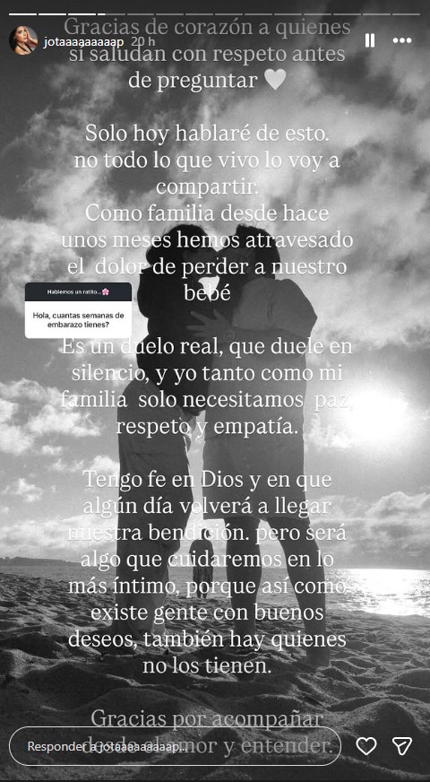 Posteriormente, confirmó la pérdida del embarazo: “Como familia, desde hace unos meses hemos atravesado el dolor de perder a nuestro bebé. Es un duelo real, que duele en silencio. Y yo, tanto como mi familia, solo necesitamos paz, respeto y empatía”.